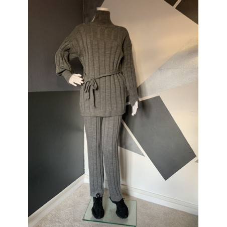 Ensemble pantalon + pull col roulé avec ceinture en maille gris